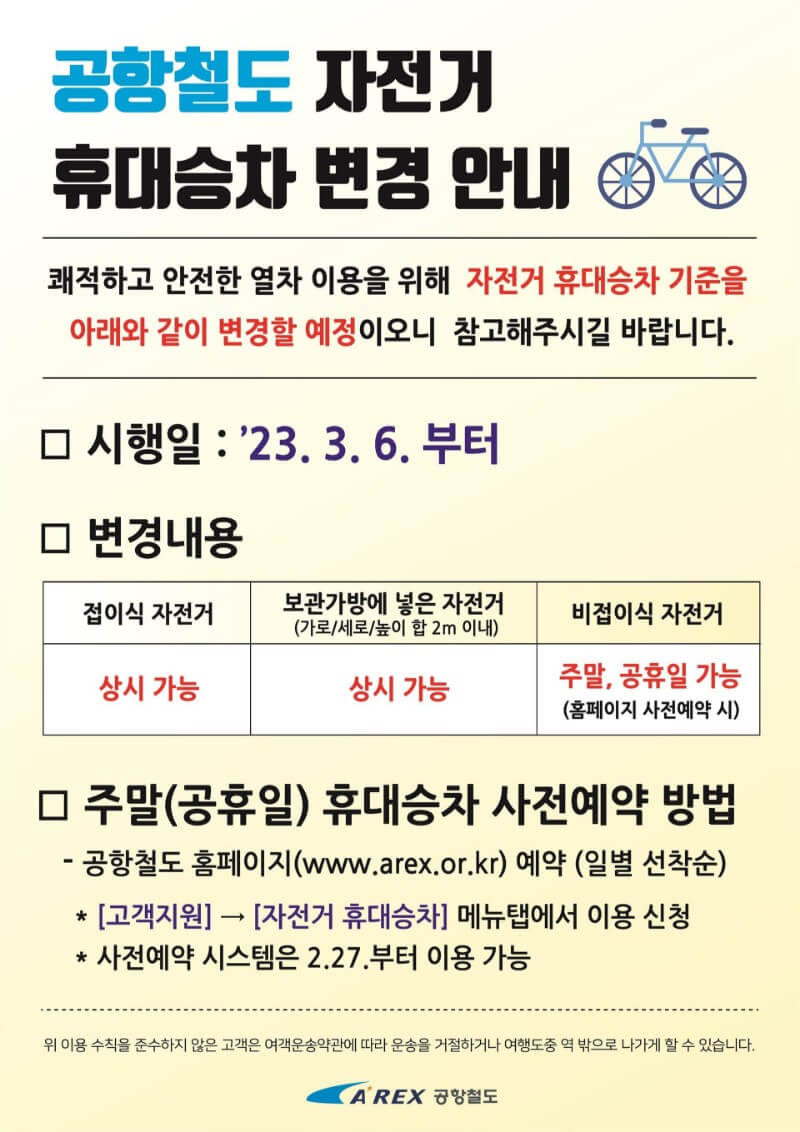 변경되는 공항철도 자전거 휴대승차 시행일은 2023년 3월 6일부터 이며, 접이식 자전거나 보관가방에 넣은 자전거(가로, 세로, 높이 합 2m 이내)의 경우 상시 휴대승차가 가능합니다. 하지만 비접이식 자전거의 경우 주말, 공휴일 이용이 가능합니다. 이 경우에도 홈페이지 사전예약한 경우에만 가능합니다.