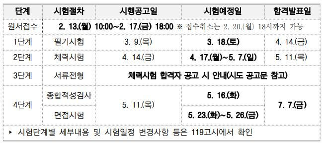 소방공무원 원서접수는 2월 13일 오전 10시부터 2월 17일 오후 6시까지 소방청 119 고시 사이트에서 할 수 있습니다. 필기시험은 3월 18일 전국 시도별 시험장에서 시행되며 체력시험, 서류전형, 종합적성검사, 면접시험 등을 거쳐서 7월 7일 최종 합격자를 발표하게 됩니다.(소방청 119 고시 바로가기)