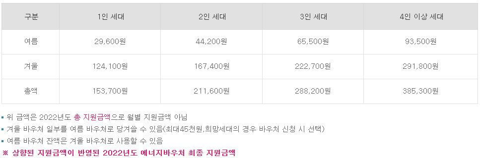 1인 가구는 여름에 29,600원, 겨울에 124,100원이 지원되어서 1년 총액 153,700원이 지원됩니다. 4인 이상 세대의 경우 여름에 93,500원, 겨울에 291,800원이 지원되어서 1년 총액 385,300원이 지원됩니다. 겨울바우처 일부를 여름바우처로 당겨서 사용하거나 여름바우처 반액을 겨울 바우처로 사용할 수 있기 때문에 놓치지 말고 유용하게 사용하셨으면 좋겠습니다.